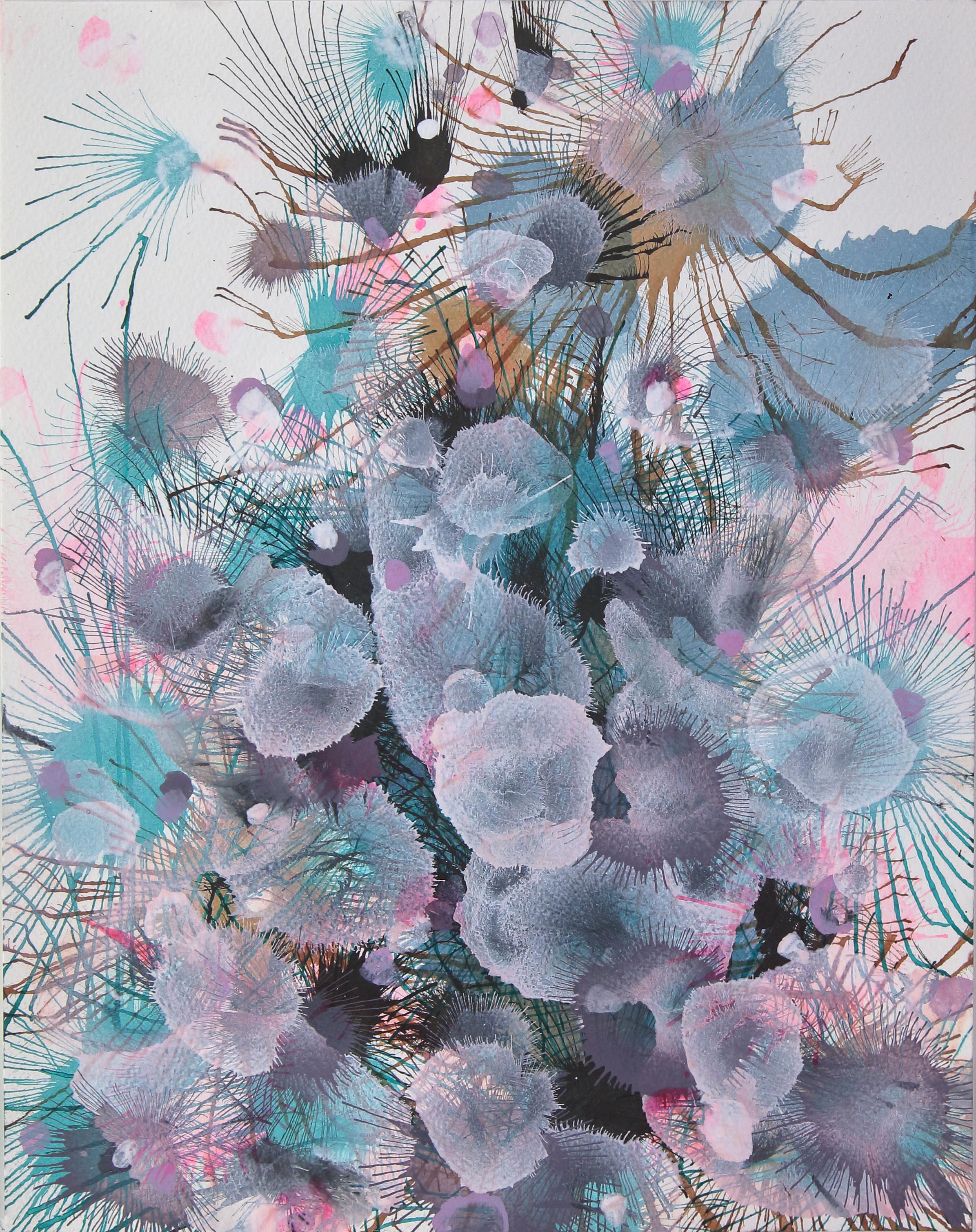 acrylic, ink, colored ink, and iridescent pigment on paper,