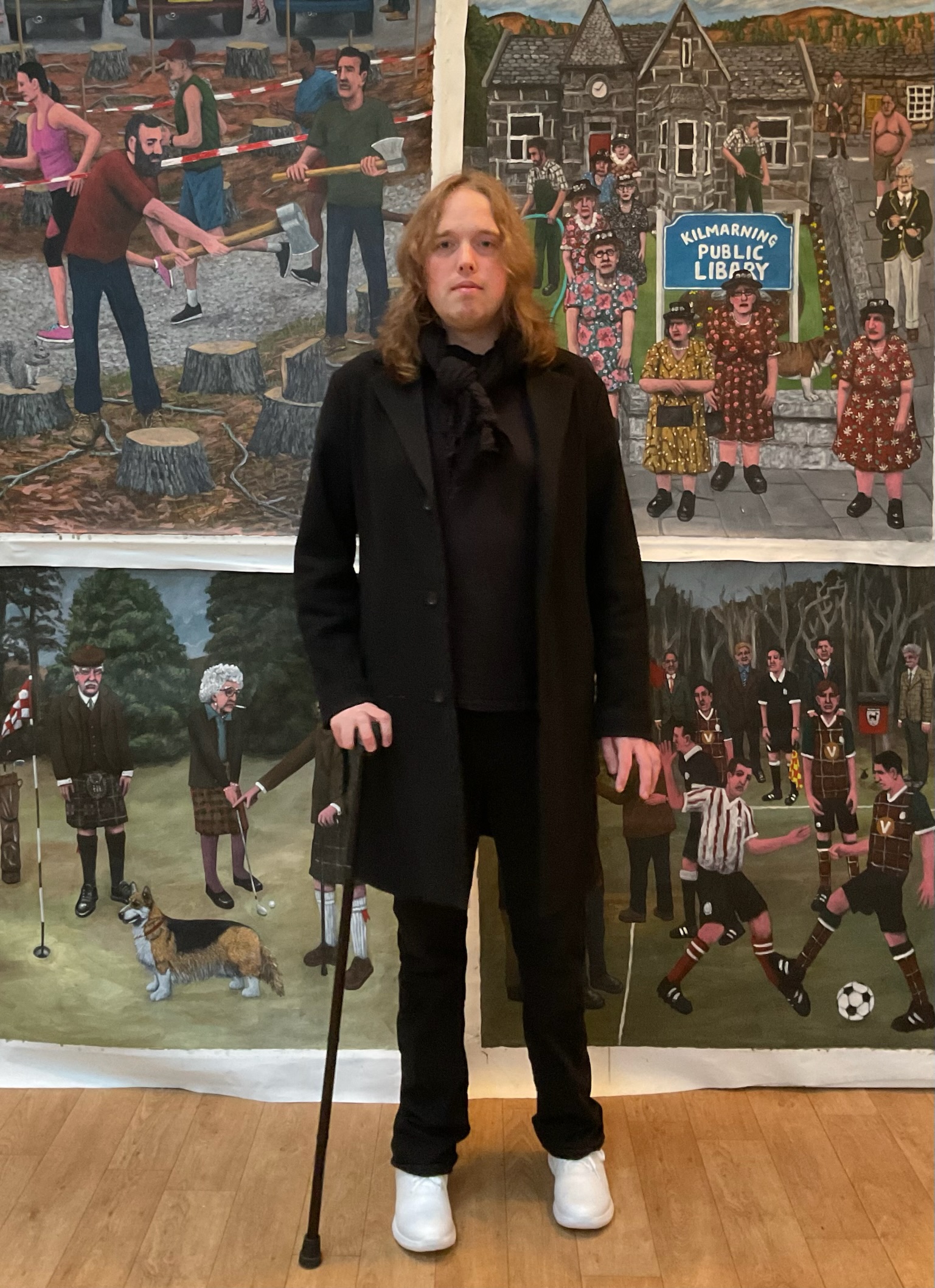 I’ve painted myself a number of times and at various stages of my life. I paint my walking stick a lot; it’s a stand in for me. Depicting disability is important to me, as I’ve never seen my condition painted before. Often these characters wear the supports I wear and look the way I look. It’s my lived experience, so it ought to be in there.