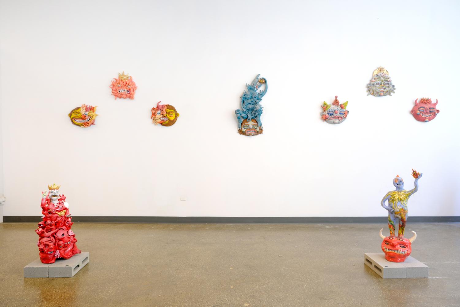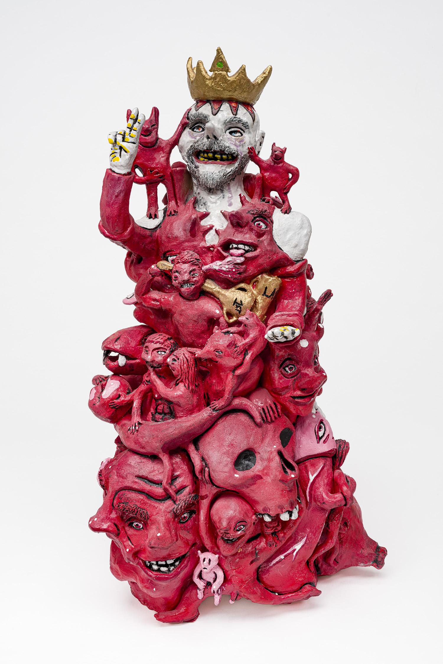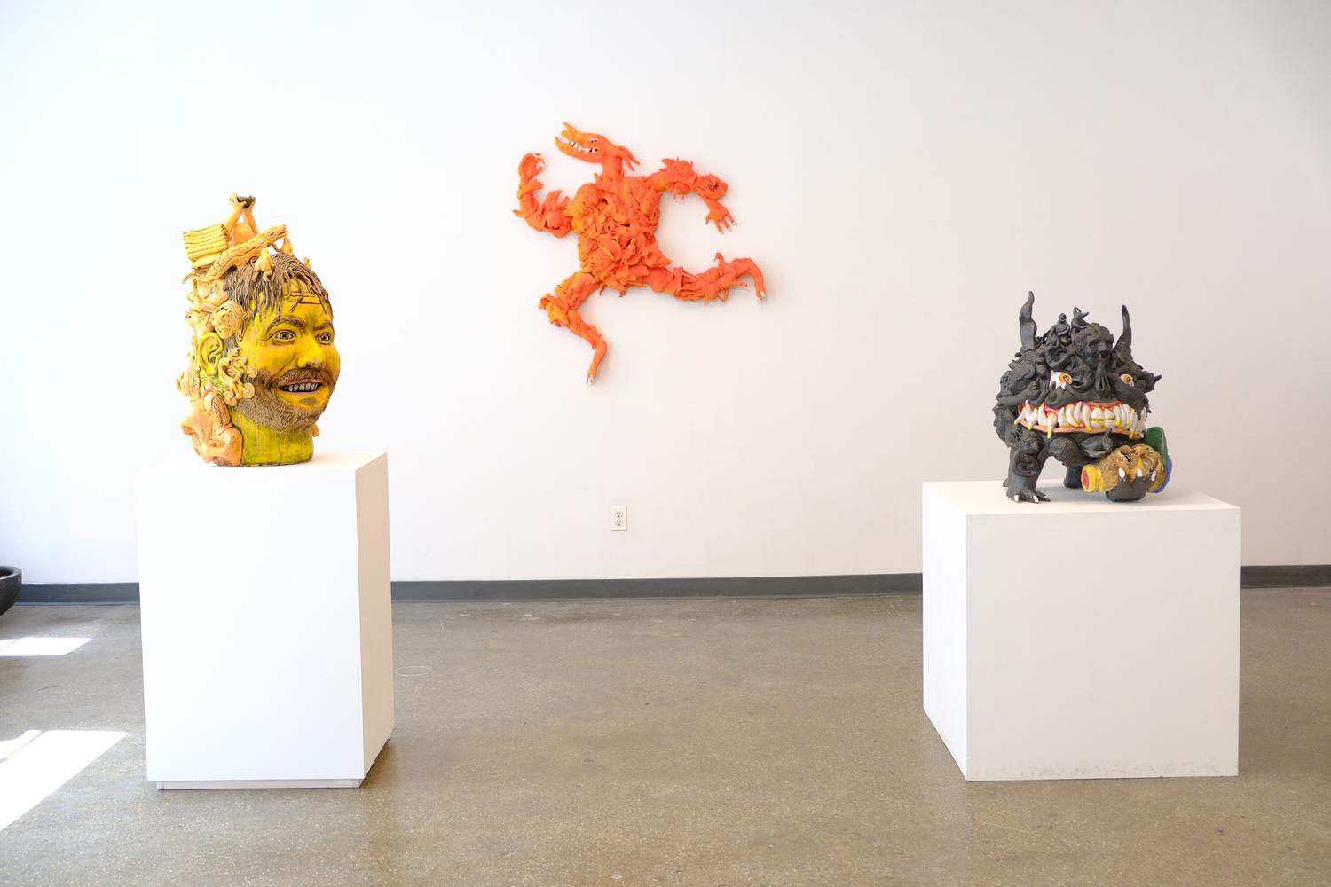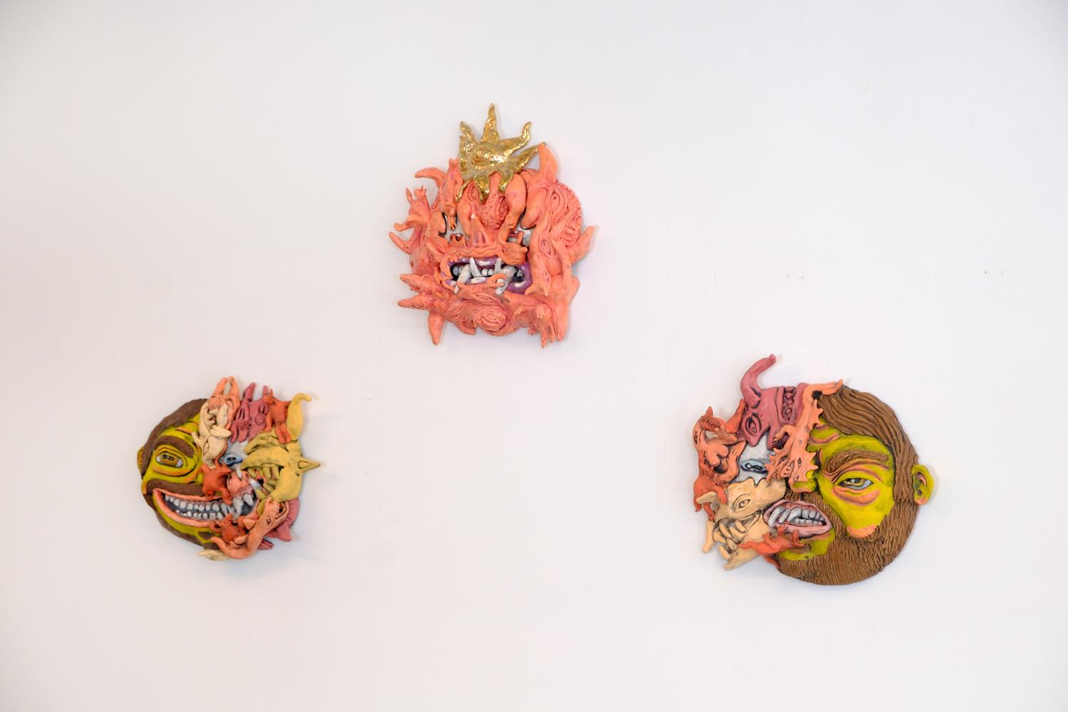 For We Are Many, a solo exhibition by sculptor and illustrator Harry Malesovas (aka CHUM), invites viewers into a surreal world where grotesque whimsy meets raw vulnerability. Through his vividly expressive figures—like the flame-wielding blue creature standing triumphantly atop a devilish red head—Malesovas externalizes the chaos of depression, anxiety, and self-doubt. His sculptures are not only reflections of emotional states, but tools of catharsis—ways of navigating and transforming his mental health struggles into something tangible, humorous, and, ultimately, connective.