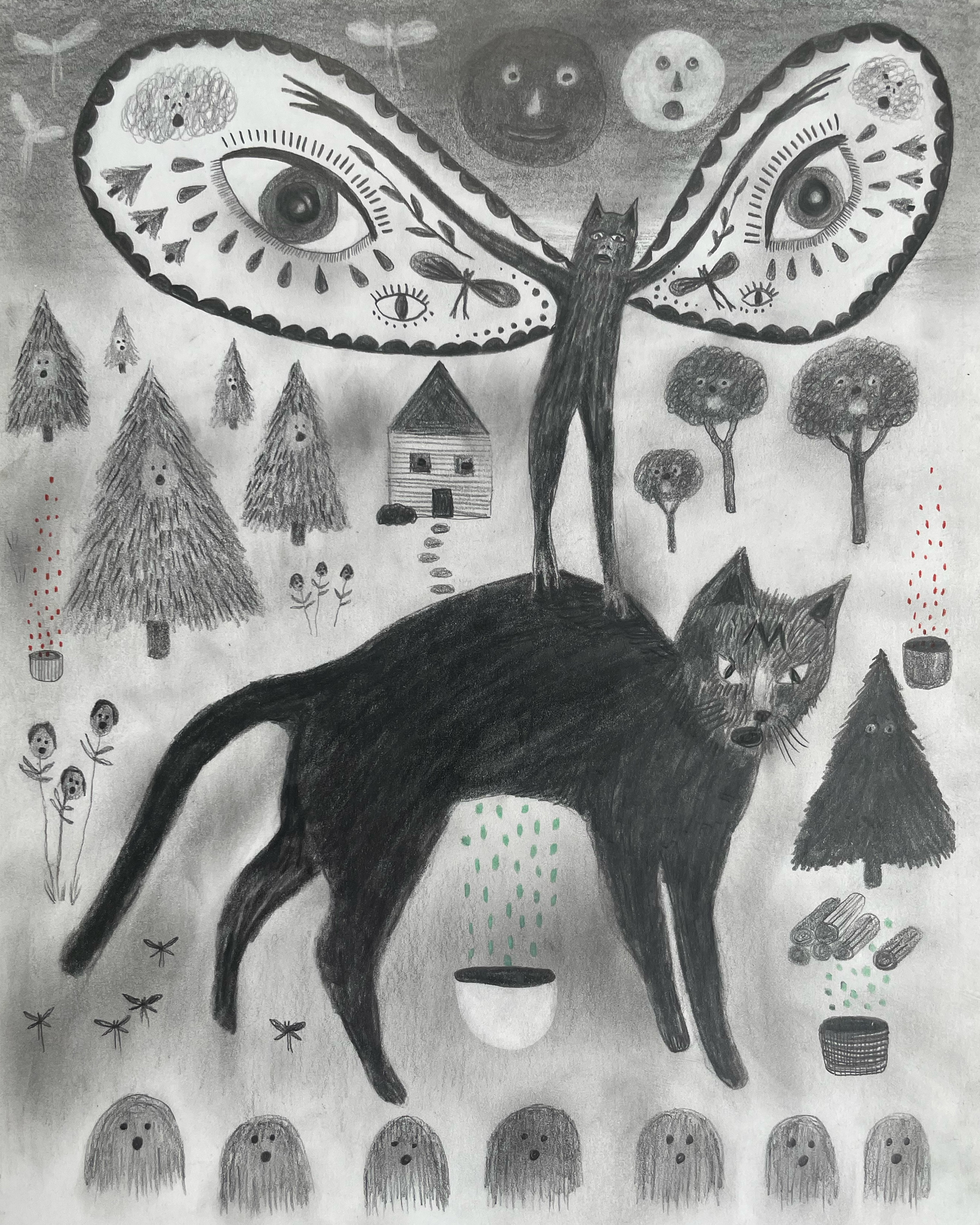 Unprimed canvas, stained and rinsed with acrylics. Oil stick, oil paint, acrylic paint, acrylic marker, graphite and airbrush details