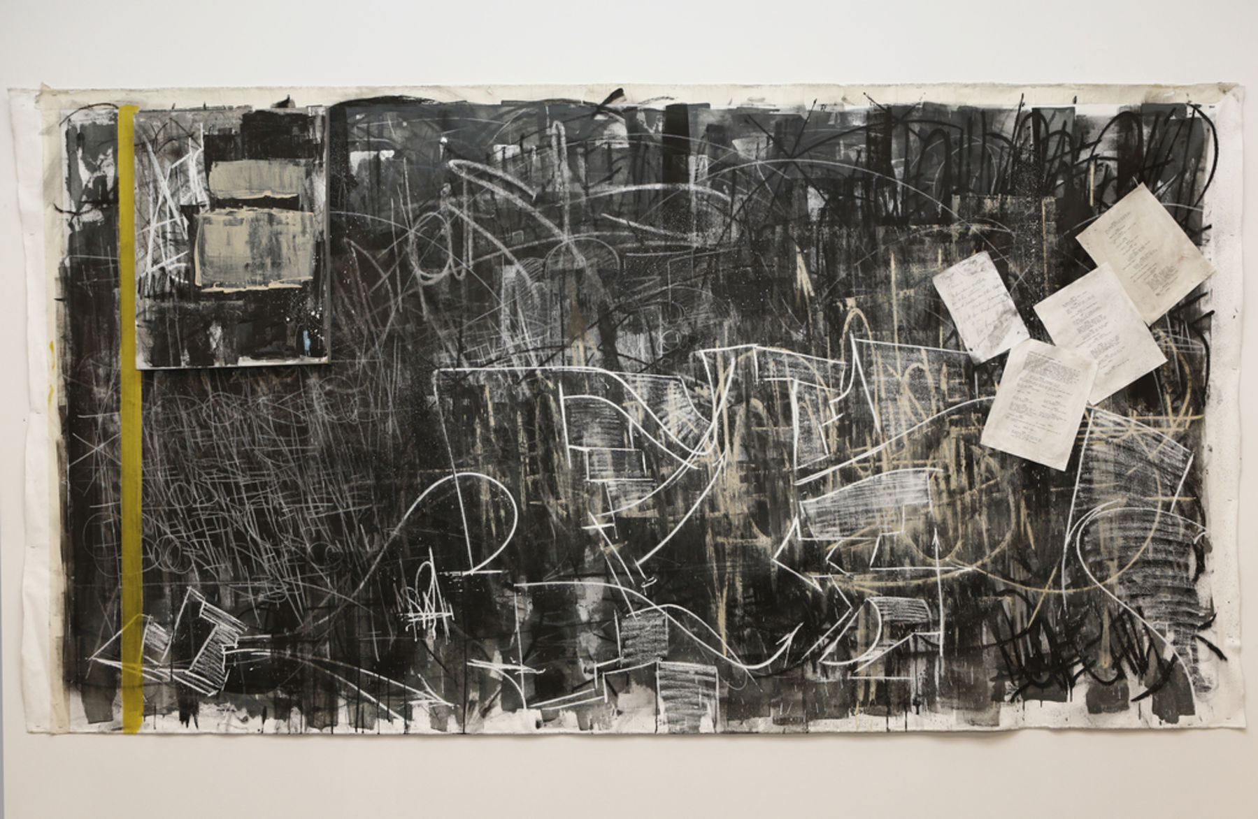 This tradition culminates here. Frenetic blacks, whites, and grays pulsate across sheets of canvas. Closerinspection reveals they are formed by words and sentences. McLeer mines memories and scrawls theirimpressions in mantra-like repetition. He urges us and himself to give in to discord; revelations often layunder the surface. The series of gestural vistas conveys the solace that was to be found in the brick andconcrete labyrinth of McLeer’s childhood neighborhood of Bay Ridge. Urban decay had become a forest ofunexpected beauty and solitude. Contained within it were both the claustrophobic quarters of working-classapartment living and the sprawling mazes of girders underneath the Verrazano Bridge- a makeshiftplayground for trespassing neighborhood children. The enormous inner chambers of its anchoragesswallowed them- vast industrial caverns, unidentifiable ceilings fading into darkness. Shadowed walls werecanvases to practice painting with a spray can. Its narrow catwalks, shuddering with passing cars andsuspended hundreds of merciless feet above water, became a jungle gym from which to steal pigeon eggs.Larger than life was the world around them. Faraway views offered by apartment building rooftops thrustupon them a sense of scale and a possibility to thrive beyond socioeconomic oblivion. Subway trains weresteel behemoths from which to learn the letterforms of graffiti- a Sunday school scripture.