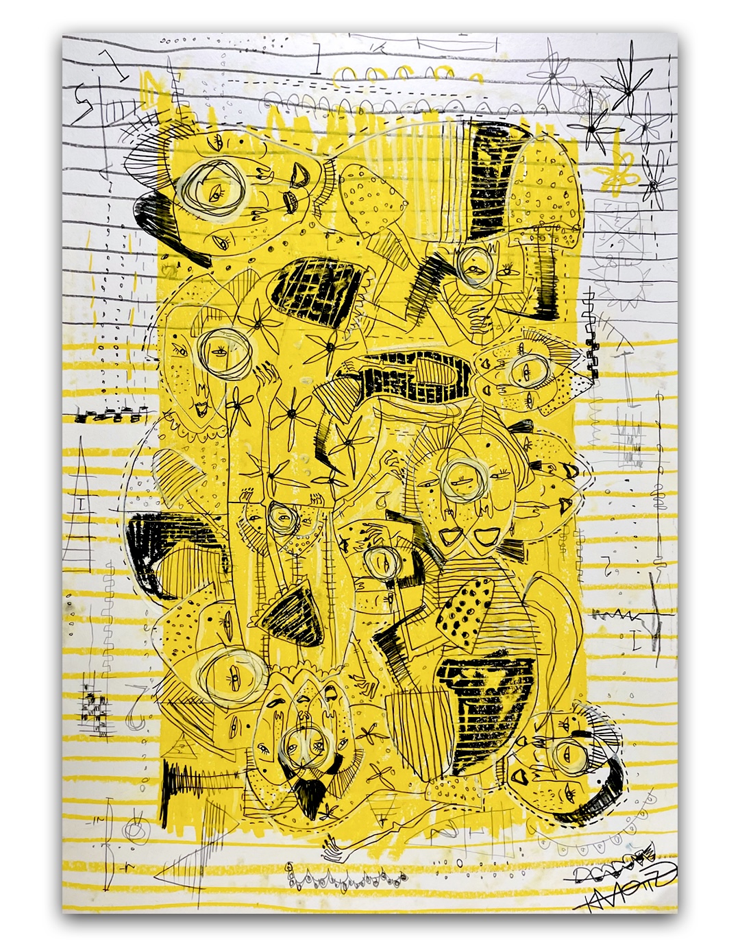 Seoul-based artist Yool Kim navigates ideas of identity and subconscious mind through mixed media artwork. Her paintings focus on figures expressing a form of disorder. This is seen not through just facial expressions, but extends throughout the painting to express dissatisfaction and dizziness that come from the human experience. Kim’s work often highlights self expression that have not yet matured, an expression stunted in growth. Her desire is to organize these emotions through her artwork. Kim was born in 1982 and graduated from Hongik University Graduate School of Industry in 2015 with a degree in Color Studies.