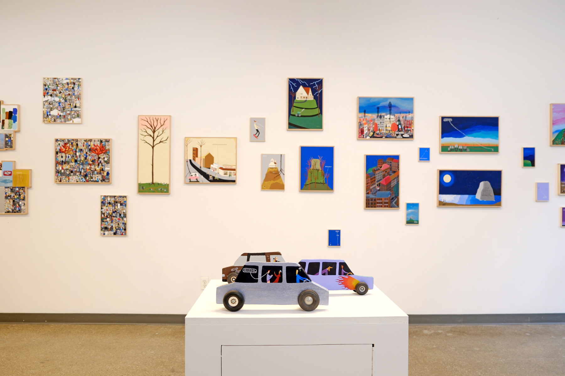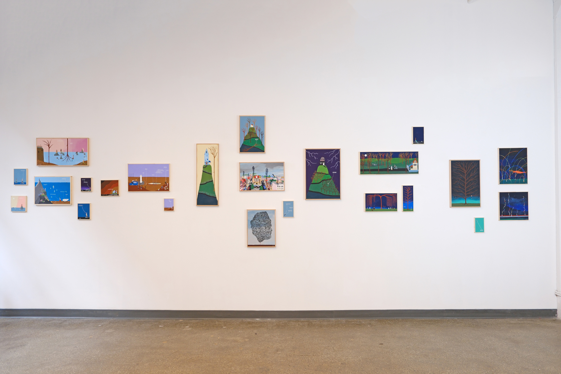 “It’s a Good Life If You Don’t Weaken” is the latest exhibition by Mary and Jiem at Court Tree Collective in Brooklyn. In this new body of work, the self-taught duo from Northern France and Belgium unveils 100 fresh paintings, each forming part of a winding journey through everyday rituals, dreamlike landscapes, and nostalgic yet ebullient memories. Their compositions feel like fragments of lived experience—moments at once intimate and expansive—woven through with anecdotes, humor, and a gentle, bittersweet emotional charge.